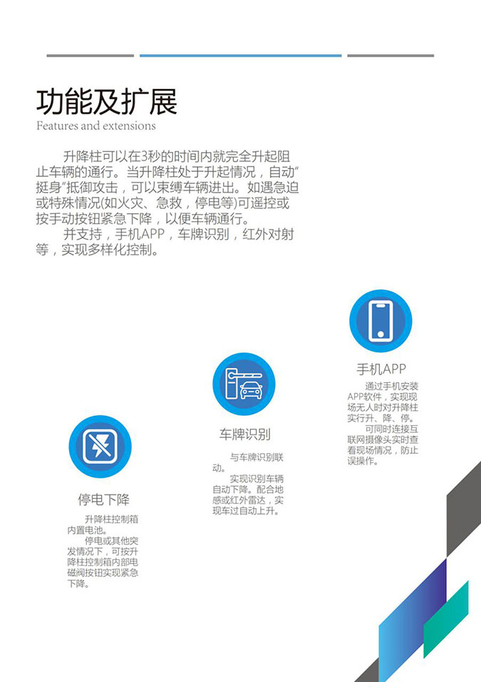预留有读卡器开闸及地感检测信号接口,配合车牌识别、冲卡防撞,可以兼容任何的开闸信号.工作电压220v. 控制电压12V.与升降柱分体安装。
